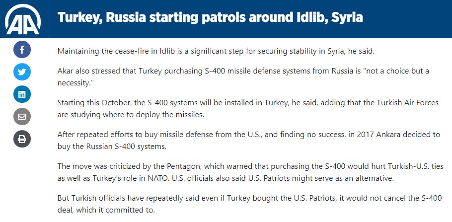 «Η ανάπτυξη των S-400 θα ξεκινήσει τον Οκτώβριο, η πολεμική αεροπορία μελετάει σε ποιες περιοχές είναι καλύτερο να εγκατασταθούν» δήλωσε ο Ακάρ.