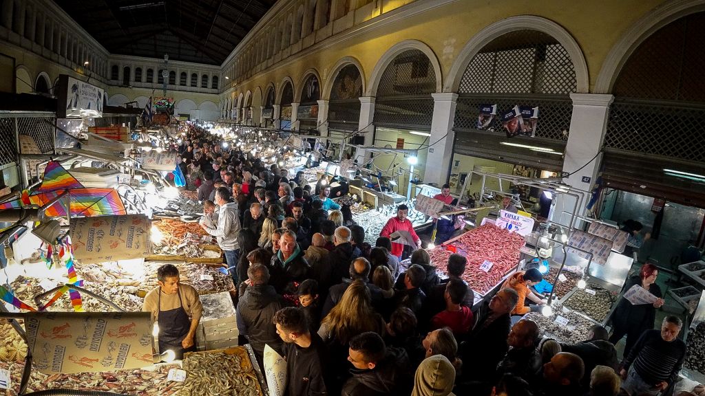 Η κεντρική ιχθυαγορά στην Βαρβάκειο άνοιξε στις 9:00 το βράδυ και τα μαγαζιά θα μείνουν ανοικτά συνεχώς μέχρι τις 2:00 το μεσημέρι της Καθαράς Δευτέρας.