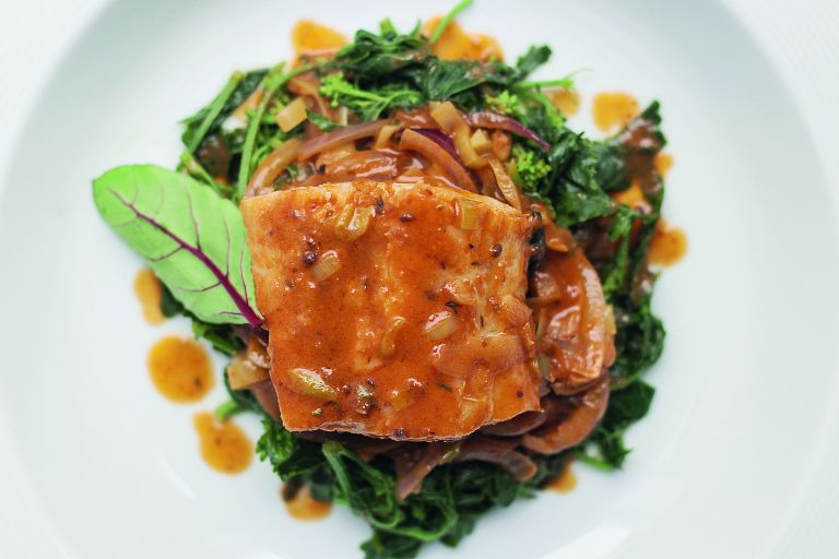 500 γρ. μαύρος μπακαλιάρος Ειρηνικού (black cod) 400 γρ. βρούβες ή σταμναγκάθι 2 φρέσκα κρεμμυδάκια ½ πράσο 1 ξερό κρεμμύδι 2 σκελίδες σκόρδο 80 ml λευκό κρασί 100 γρ. πελτές ντομάτας 1 φύλλο δάφνης ½ κ.γ. φρέσκο ή ξερό θυμάρι Φρεσκοτριμμένο πιπέρι 4 κ.σ. εξαιρετικά παρθένο ελαιόλαδο Αφρός αλατιού