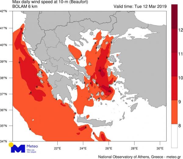 Οι άνεμοι θα πνέουν στο Βόρειο Αιγαίο από βόρειες διευθύνσεις και στο υπόλοιπο Αιγαίο από νοτιοδυτικές διευθύνσεις θυελλώδεις 8 μποφόρ, όπου γρήγορα θα ενισχυθούν και βαθμιαία θα στραφούν παντού σε βόρειους πολύ θυελλώδεις 9 μποφόρ και τοπικά στο Κεντρικό Αιγαίο με εντάσεις 10 μποφόρ, ενώ στο Ιόνιο από βορειοδυτικές διευθύνσεις θυελλώδεις έως πολύ θυελλώδεις 8-9 μποφόρ, με βαθμιαία εξασθένηση στο Βόρειο Ιόνιο.