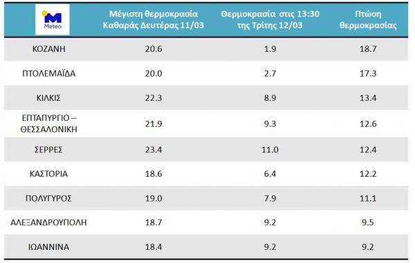 Στον πίνακα που ακολουθεί παρουσιάζεται η πτώση της θερμοκρασίας σε επιλεγμένες πόλεις της Βόρειας Ελλάδας, όπως αυτή καταγράφηκε από τους αυτόματους μετεωρολογικούς σταθμούς του Εθνικού Αστεροσκοπείου Αθηνών/meteo.gr.