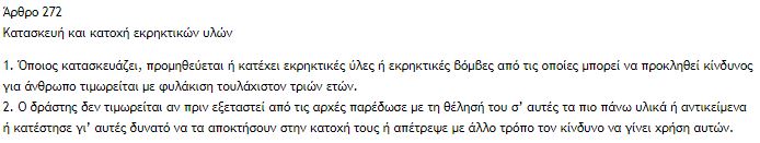 Συγκεκριμένα, στο άρθρο 272 του νέου Ποινικού Κώδικα σημειώνεται ότι «Όποιος κατασκευάζει, προμηθεύεται ή κατέχει εκρηκτικές ύλες ή εκρηκτικές βόμβες από τις οποίες μπορεί να προκληθεί κίνδυνος για άνθρωπο τιμωρείται με φυλάκιση τουλάχιστον τριών ετών».