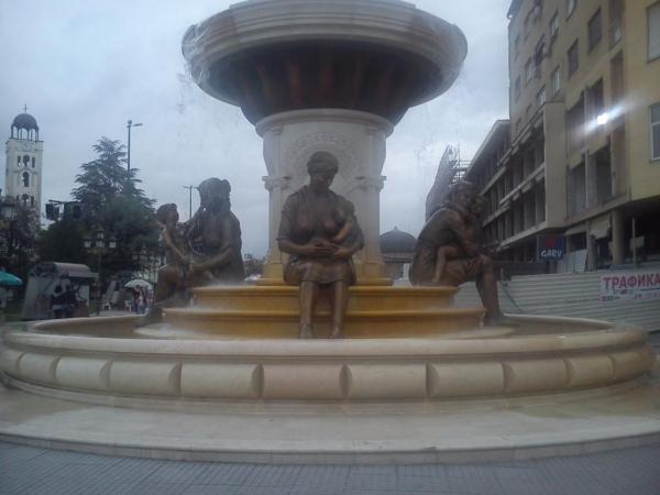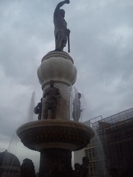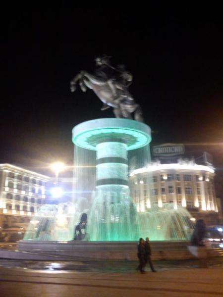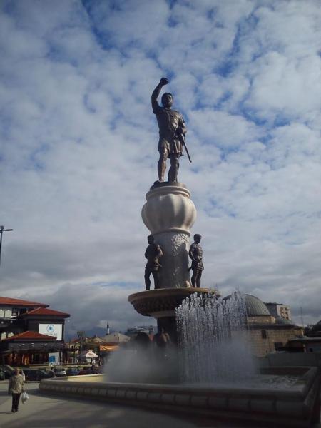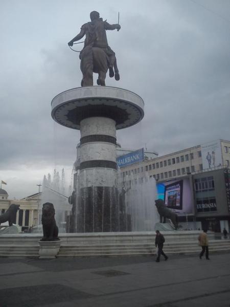 Το άγαλμα του Μεγάλου Αλεξάνδρου («έφιππο πολεμιστή» τον αποκαλεί επισήμως η κυβέρνηση) είναι αυτό που κυριαρχούσε σε όλη την πόλη καθώς βρίσκεται στην κεντρική πλατεία κι έχει μέγεθος οκταόροφης πολυκατοικίας. Στη βάση του διακρίνονται πολεμιστές με δόρατα και ασπίδες και λέοντες που βγάζουν νερό από το στόμα. Νεροκουρτίνες και φώτα νέον. «Το άγαλμα του Αλέξανδρου είναι τόσο αυθεντικό όσο η απομίμηση του Μεγάλου Καναλιού της Βενετίας στο Λας Βέγκας» είχε γράψει ο απεσταλμένος του γερμανικού περιοδικού.