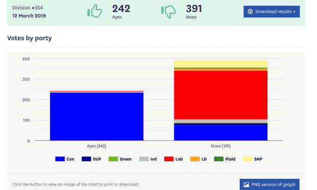 «Ναι» στην πρόταση της Μέι είπαν 242 βουλευτές, ενώ «όχι» είπαν 391, πράγμα που σημαίνει ότι η Μέι το μόνο που κατάφερε ήταν να μειώσει την ήττα της στις 149 ψήφους