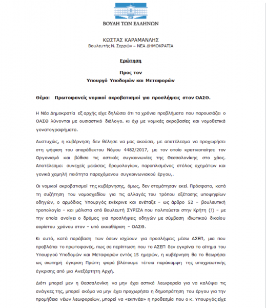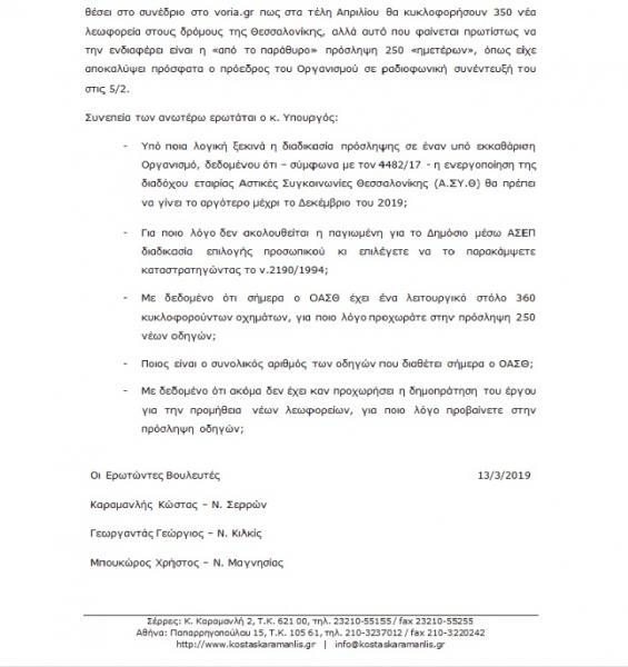 Οι δύο βουλευτές κατηγορούν την η κυβέρνηση ότι οδήγησε τις αστικές συγκοινωνίες σε «χάος» και προχωρά σε προσλήψεις την ώρα που ο ΟΑΣΘ βρίσκεται υπο εκκαθάριση και καλούν τον αρμόδιο υπουργό να απαντήσει