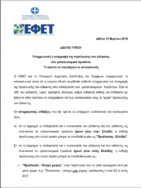 Ο Ενιαίος Φορέας Ελέγχου Τροφίμων και το Υπουργείο Αγροτικής Ανάπτυξης και Τροφίμων καλεί τις επιχειρήσεις να αναγράφουν υποχρεωτικά την προέλευση στα γαλακτοκομικά τους προϊόντα και τους καταναλωτές να δίνουν προσοχή στη σχετική επισήμανση στην ετικέτα.