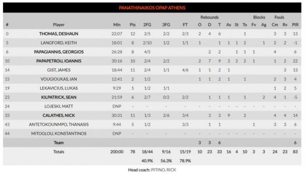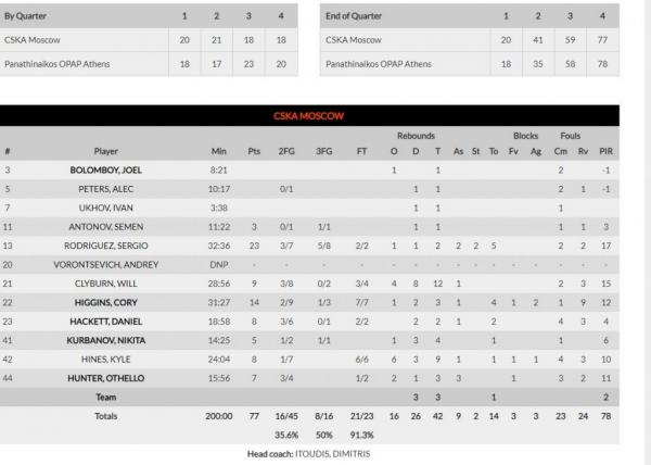 Οι δυο ομάδες ήταν άστοχες έχοντας 8/22 διπ η ΤΣΣΚΑ και 9/23 διπ ο Παναθηναϊκός σε ένα παιχνίδι όπου κυριαρχούσαν οι δυνατές άμυνες.