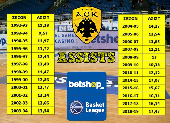 Η ΑΕΚ είναι 4η στις ασίστ στη φετινή Betshop Basket League με μέσο όρο 17,47, πίσω μόνο από τον Παναθηναϊκό ΟΠΑΠ (21,56), τον Ολυμπιακό (21,44) και τον Προμηθέα (18,94). Η “Ένωση” μάλιστα βαδίζει προς ένα ιστορικό ρεκόρ καθώς η επίδοση που έχει μετά από 19 αγωνιστικές είναι μεγαλύτερη από εκείνες που είχε σε όλη τη διαδρομή της στην κατηγορία…