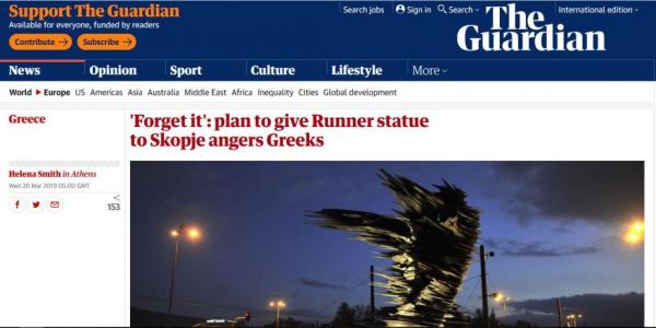 «Σε ένα έθνος που εξευτελίστηκε από τις λεηλασίες των χρόνων οικονομικής κρίσης και ακόμη πονά για την ιστορική συμφωνία της αριστερής κυβέρνησης με τη Βόρεια Μακεδονία, η πρόταση χτύπησε ένα απρόσμενα ερεθισμένο νεύρο» σχολιάζει ο Guardian για την αντίδραση των Ελλήνων στην πρόταση για ανταλλαγή του «Δρομέα». «Η προοπτική της ανταλλαγής του «Δρομέα» με ένα κιτς άγαλμα του Μ. Αλεξάνδρου, που ευρέως θεωρείται ότι έχει γίνει «αρπαγή» του από τους Σλάβους γείτονες στο πλαίσιο του πολιτιστικού πολέμου για την αξίωση του ονόματος Μακεδονία, ήταν το… κερασάκι στην τούρτα» συνεχίζει το δημοσίευμα.