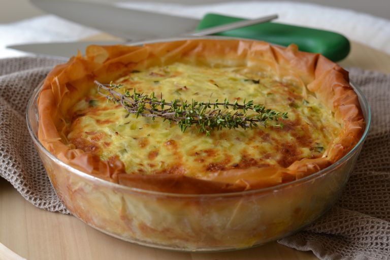 Απλώνουνε το περιεχόμενο του τηγανιού στη βάση του φύλλου. Χτυπάμε καλά σε ένα μπολ τα αβγά και στη συνέχεια προσθέτουμε το γάλα, το τσένταρ, αλάτι και πιπέρι. Ανακατεύουμε καλά και αδειάζουμε το μείγμα μέσα στο ταψί, πάνω από τα σοταρισμένα λαχανικά. Τρίβουμε από πάνω λίγο φρέσκο θυμάρι και ψήνουμε για 30-40 λεπτά.