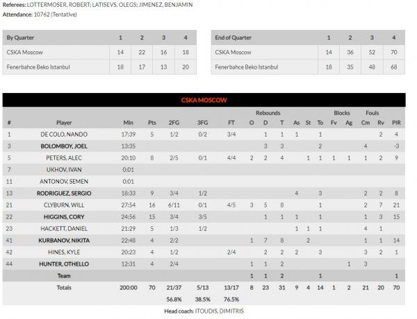 Η ΤΣΣΚΑ Μόσχας του Δημήτρη Ιτούδη επικράτησε 70-68 της Φενέρμπαχτσε του Ζέλικο Ομπράντοβιτς στην 28η αγωνιστική της Euroleague, αλλά δεν κατάφερε να καλύψει τη διαφορά του πρώτου αγώνα
