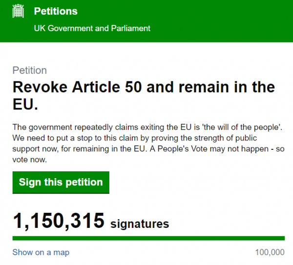 Η αίτηση για «Ανάκληση του Άρθρου 50 και παραμονή στην ΕΕ» στην ιστοσελίδα του κοινοβουλίου είχε προσελκύσει 1.150.315 υπογραφές έως τις 19:50 ώρα Ελλάδας, χάρη στη στήριξη στα μέσα κοινωνικής δικτύωσης, αν και η ιστοσελίδα φάνηκε να ‘κρασάρει’ αρκετές φορές λόγω του μεγάλου αριθμού χρηστών που προσπαθούσαν να υπογράψουν.