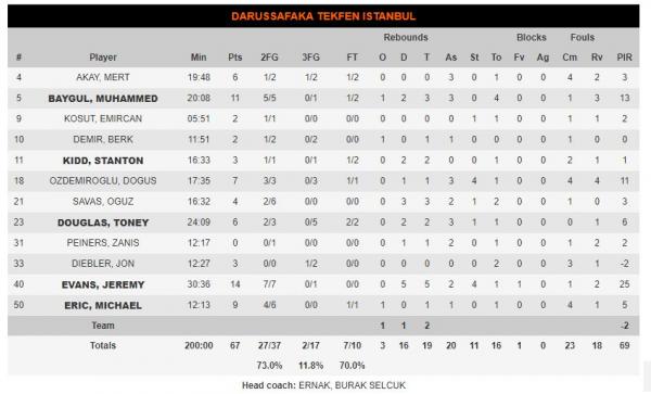 Όσον αφορά το ματς με την ουραγό Νταρουσάφακα δεν αντέχει σε κριτική, καθώς οι Τούρκοι παρουσιάστηκαν ανταγωνιστικοί για μόλις ένα δεκάλεπτο. Ηδη στο ημίχρονο το σκορ είχε διαμορφωθεί στο +19 (49-30) για τους γηπεδούχους, με τη διαφορά να αγγίζει τους 25π. (62-37) στο τρίτο δεκάλεπτο και τους 31 στο τέταρτο (85-54).