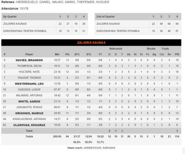 Η Ζαλγκίρις Κάουνας διέλυσε την ουραγό Νταρουσάφακα (94-67), έφτασε τις 13 νίκες και θα τα παίξει «όλα για όλα» για την πρόκριση την επόμενη αγωνιστική κόντρα στον Ολυμπιακό στο ΣΕΦ