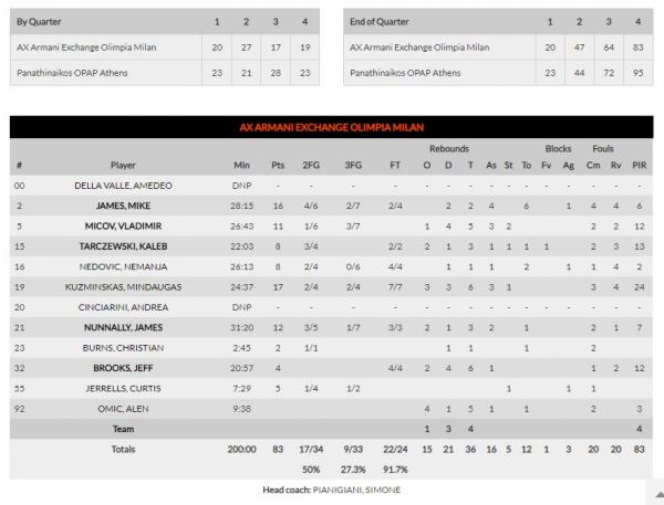 Από την Αρμάνι οι Κουζμίνσκας (17π.) και Νάναλι (12π.) προσπάθησαν, ενώ ο Τζέιμς είχε 16 πόντους με 2/7τρίπ και 6 λάθη.