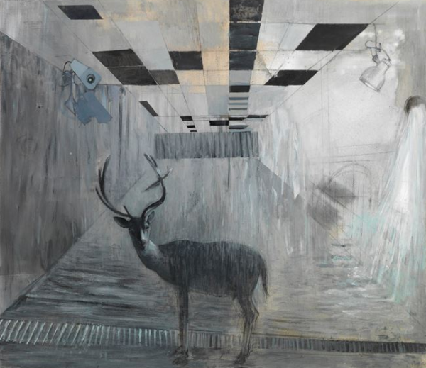 Τόποι ανορθόδοξοι, εσωτερικοί χώροι χωρίς όρια, σκοτεινά χάσματα, δάπεδα με υπερχειλίζοντα νερά, φανερώνουν και αποσιωπούν μια προειδοποίηση, μια δυνητική απειλή, εμπλέκοντας αβίαστα τον θεατή σε ερμηνείες και προσωπικές αναγνώσεις. Η ανησυχία, ακαθόριστη αλλά ισχυρή, διατρέχει τη σιωπή των τελάρων σαν ηλεκτρικό ρεύμα.