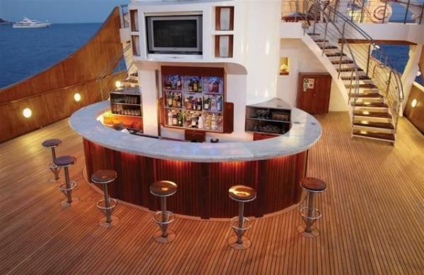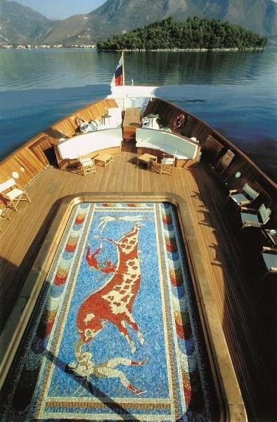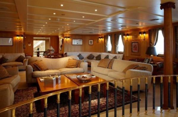 Η βιβλιοθήκη της θαλαμηγού είναι γεμάτη με έργα Ελλήνων κλασικών συγγραφέων, τα σκαμνιά του μπαρ είναι καλυμμένα με δέρμα λευκής φάλαινας, ενώ ο πυθμένας της πισίνας υψώνεται ως το επίπεδο του καταστρώματος και μετατρέπεται σε πίστα χορού, διακοσμημένη με ψηφιδωτά που απεικονίζουν σκηνές από την ελληνική μυθολογία.