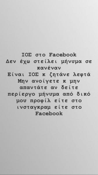 Η ίδια έγραψε ένα προειδοποιητικό μήνυμα: «Ιός στο Facebook. Δεν έχω στείλει μήνυμα σε κανέναν. Είναι ιός και ζητάνε λεφτά. Μην ανοίγετε και μην απαντάτε αν δείτε περίεργο μήνυμα από δικό μου προφίλ είτε στο Instagram είτε στο Facebook».