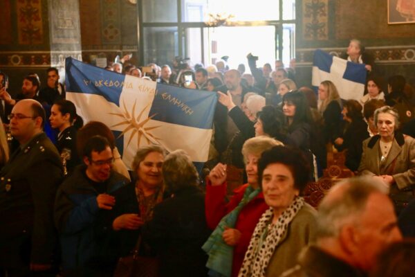 Οι πιστοί σήκωσαν ελληνικές σημαίες και όταν τελείωσε ο εθνικός ύμνος, τραγούδησαν το «απαγορευμένο» εμβατήριο «Μακεδονία Ξακουστή».