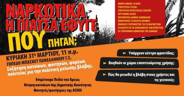 Κάτοικοι του κέντρου της Αθήνας και φοιτητές του Οικονομικού Πανεπιστημίου (πρώην ΑΣΟΕΕ) ενώνουν τις δυνάμεις τους στη μάχη κατά των εικόνων εξαθλίωσης στις γειτονιές τους από το αλισβερίσι ναρκωτικών ουσιών και καλούν τους εμπλεκόμενους σε μια μεγάλη συζήτηση την ερχόμενη Κυριακή στο Πεδίον του Άρεως. Και ενώ η πιάτσα της οδού Μαυροματαίων (έξω από το πάρκο, μπροστά στο Green Park) –μία από τις μεγαλύτερες στην Αθήνα- διαλύθηκε κατόπιν αστυνομικών επεμβάσεων, τα κρίσιμα ερωτήματα παραμένουν: «Λύθηκε το πρόβλημα; Υπάρχουν κέντρα φροντίδας; Θα βοηθήσουν οι χώροι εποπτευόμενης χρήσης; Πως θα μειωθεί η βλάβη στους χρήστες και τις γειτονιές;».