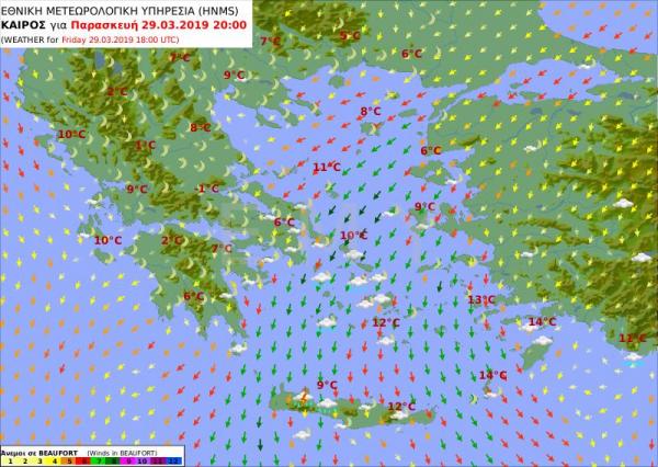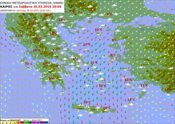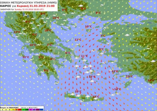 Την Κυριακή (1 Απριλίου) στα ανατολικά και τα νότια νεφώσεις παροδικά αυξημένες, με τοπικές βροχές κυρίως στα νότια και πρόσκαιρες χιονοπτώσεις στα ορεινά της Κρήτης. Στις υπόλοιπες περιοχές λίγες παροδικές νεφώσεις. Οι άνεμοι από βόρειες διευθύνσεις 4 με 6 και στο Αιγαίο 7, πιθανώς πρόσκαιρα έως 8 μποφόρ. Η θερμοκρασία σε μικρή άνοδο.
