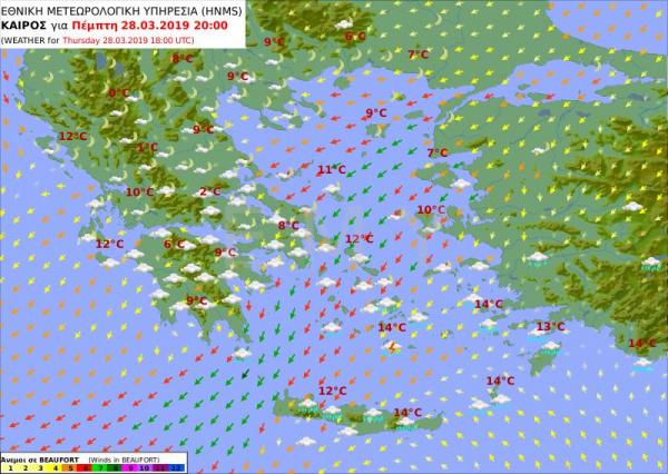 Την Πέμπτη (28 Μαρτίου) νεφώσεις με τοπικές βροχές κυρίως στα δυτικά, τα κεντρικά και τα νότια. Σποραδικές καταιγίδες, πιθανώς κατά τόπους ισχυρές, θα εκδηλωθούν κυρίως στις κεντρικές και νότιες θαλάσσιες-παραθαλάσσιες περιοχές. Χιονοπτώσεις στα ορεινά και βαθμιαία σε ημιορεινές περιοχές της κεντρικής και βόρειας ηπειρωτικής χώρας.