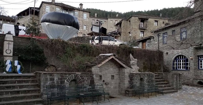 Τις τελευταίες ώρες έφτασαν στο Τσεπέλοβο δεκάδες αυτοκίνητα και βαν με ειδικό εξοπλισμό και το απόγευμα της Δευτέρας το ενδιαφέρον όλων τράβηξε το… αερόστατο (φωτό κάτω) που στήθηκε στην κεντρική πλατεία, εκεί όπου ξεκινούν τα γυρίσματα.
