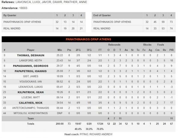 Από τον Παναθηναϊκό διακρίθηκαν οι Λάνγκφορντ (14π.) και Καλάθης (14π., 1/8τρ, 9ας)