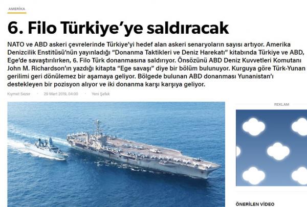 Σενάρια πολέμου ανάμεσα σε Τουρκία και ΗΠΑ «βλέπει» η φιλοκυβερνητική τουρκική εφημερίδα Yeni Safak στο πρωτοσέλιδο της με τίτλο : «Ο 6ος στόλος θα επιτεθεί στην Τουρκία». Πιο συγκεκριμένα η εφημερίδα υποστηρίζει ότι τα σενάρια στρατιωτικής επέμβασης στην Τουρκία στο περιβάλλον των ΗΠΑ και του ΝΑΤΟ αυξάνονται και κάνει συγκεκριμένη αναφορά στο βιβλίο του αρχηγού των ναυτικών επιχειρήσεων των ΗΠΑ, Τζον Ρίτσαρντσον, με τίτλο «Fleet Tactics and Naval Operations», το οποίο και επικαλείται. Θέμα του βιβλίου είναι αναλύσεις για διάφορα σενάρια πολέμου, μεταξύ αυτών και στην περιοχή του Αιγαίου.