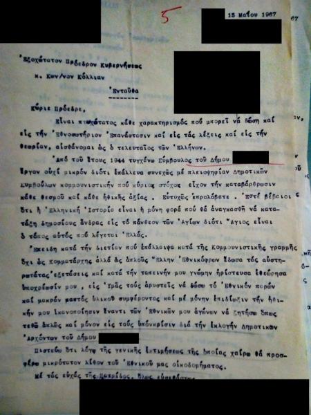 Ο πρόεδρος της Εθνικής Ενώσεως Αναπήρων και Θυμάτων Πολέμου ακριτικής πόλης ενημερώνει ότι ο τότε δήμαρχος «τυγχάνει επικινδυνέστερος του Ανδρέα Παπανδρέου», ενώ ο προτεινόμενος αντικαταστάτης του είναι «αντιπαθέστερος του πρώτου λόγω μεγίστου Σατραπισμού του και περιφρονήσεως των πάντων».