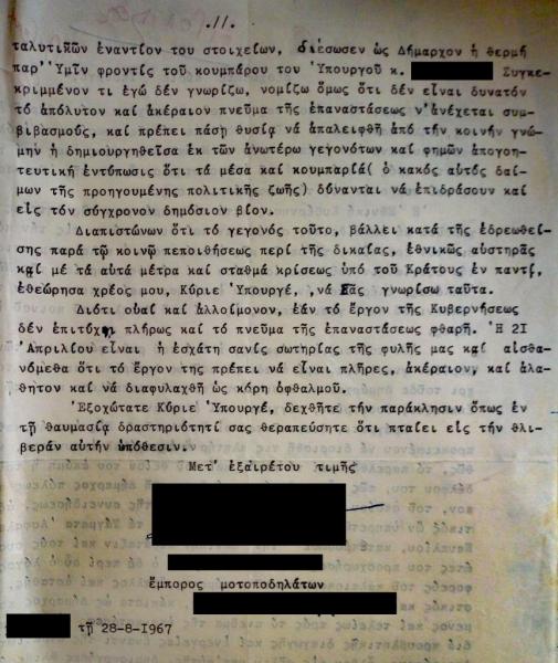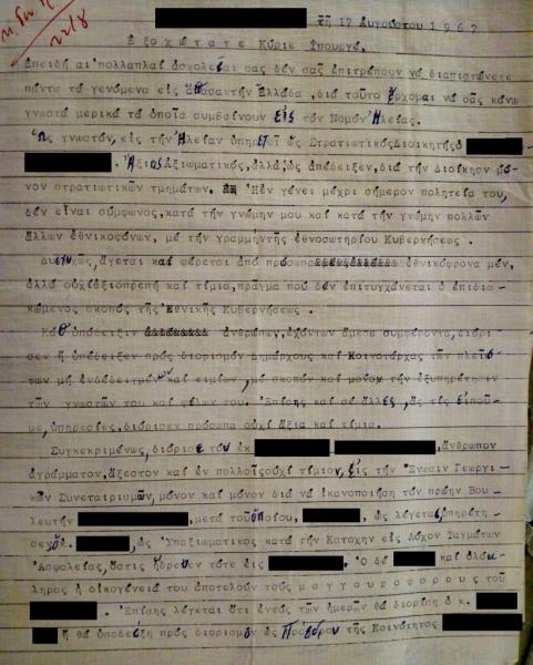 Στρατιωτικός Διοικητής στην Ηλεία καταγγέλλεται ότι «άγεται και φέρεται από πρόσωπα εθνικόφρονα μεν, αλλά ουχί αξιοπρεπή και τίμια», διόρισε στην Ένωση Γεωργικών Συνεταιρισμών, «άνθρωπον αγράμματον, άξεστον και ουχί τίμιον, μόνο και μόνο για να ικανοποιήσει πρώην βουλευτή, με τον οποίο υπηρέτησαν μαζί στην Κατοχή στα Τάγματα Ασφαλείας, ενώ και ολόκληρη η οικογένειά του αποτελούσε τους μαγγουροφόρους του».