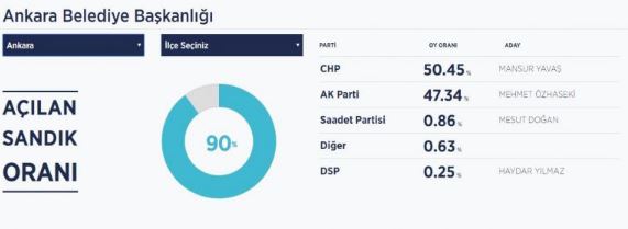 Σύμφωνα με το πρακτορείο Anadolu, ο υποψήφιος του Ρεπουμπλικανικού Κόμματος (CHP) και του Καλού Κόμματος (Iyi) για τη δημαρχία της Άγκυρας Μανσούρ Γιαβάς συγκεντρώνει ποσοστό 50,36%, έναντι 47,42% για τον Μεχμέτ Οζακεσί του AKP με καταμετρημένο το 89% των ψήφων.