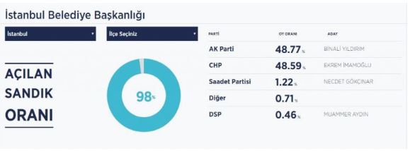 «Δεν εμπιστευόμαστε τα αποτελέσματα του ειδησεογραφικού πρακτορείου Anadolu» δήλωσε ο υποψήφιος του συνασπισμού της αντιπολίτευσης CHP-Καλό Κόμμα στην Κωνσταντινούπολη Εκρέμ Ιμάμογλου λέγοντας ότι τα δικά του ποσοστά είναι 53,2% έναντι του ανθυποψηφίου του κυβερνητικού συνασπισμού ΑΚΡ-ΜΗΡ Μπιναλί Γιλντιρίμ τα ποσοστά του οποίου είναι 40,1%.