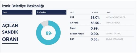 Στη Σμύρνη, ο υποψήφιος από το Ρεπουμπλικανικό Λαϊκό Κόμμα (CHP), Μουσταφά Σογιέρ, καταγράφει ποσοστό 58,02% έναντι του υποψηφίου του AKP, Νιχάτ Ζεϊμπεκσί (38,47%) με καταμετρημένο το 86% των ψήφων, σε μια περιφέρεια που το αποτέλεσμα έχει ξεκαθαρίσει από νωρίς.