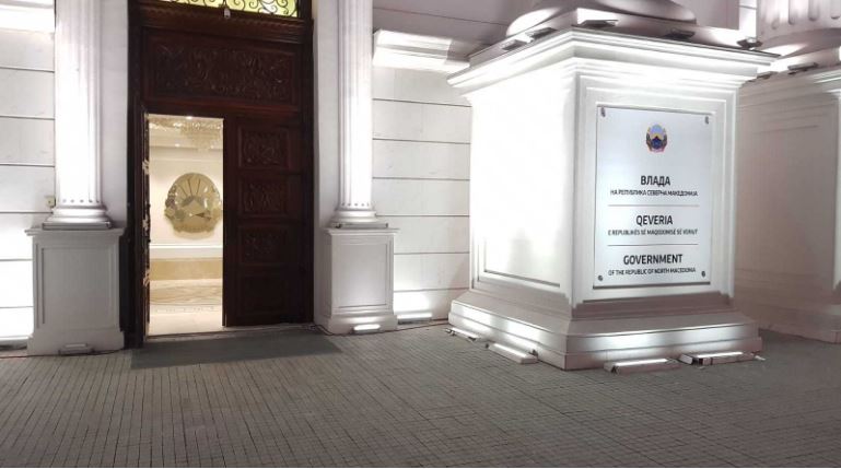 Η πινακίδα είναι σε τρεις γλώσσες, τη σλαβική, την αλβανική και την αγγλική και σε αυτήν αναγράφεται «Κυβέρνηση της Δημοκρατίας της Βόρειας Μακεδονίας».