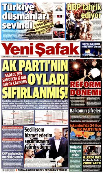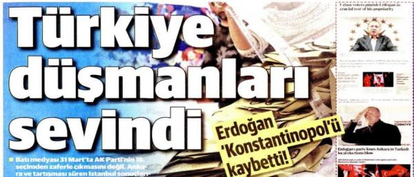 Η τουρκική φιλοκυβερνητική εφημερίδα Yeni Safak, αναφέρει σε πρωτοσέλιδο δημοσίευμα της, αναφορικά με την απώλεια της Κωνσταντινούπολης για το κόμμα του Ρ. Ερντογάν: «Χάρηκαν οι εχθροί της Τουρκίας»