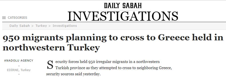 Για φήμες πως η Τουρκία θα ανοίξει τα σύνορα με την Ελλάδα, με αποτέλεσμα χιλιάδες πρόσφυγες να κατευθύνονται προς τον Έβρο, κάνει λόγο η Daily Sabah, υποστηρίζοντας ότι μόνο χθες οι τουρκικές αρχές σταμάτησαν 950 παράνομους μετανάστες που προσπαθούσαν να περάσουν στην Ελλάδα.