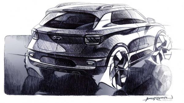 Μέχρι τότε τα σκίτσα που έχει δώσει στη δημοσιότητα η Hyundai, εκτός από το περιορισμένο χωροταξικό του αποτύπωμα προδίδουν τη σχεδιαστική του συνάφεια με το Kona αλλά και την ίδια έμφαση σε δίπτυχο εκκεντρικότητας και αιχμηρού design.