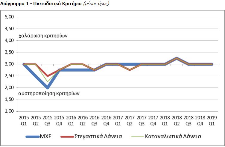 Tο α΄ τρίμηνο του 2019, τα κριτήρια χορήγησης δανείων προς τις μη χρηματοπιστωτικές επιχειρήσεις (ΜΧΕ) παρέμειναν αμετάβλητα σε σχέση με το δ΄ τρίμηνο του 2018, εξέλιξη σύμφωνη με τις προσδοκίες που είχαν διατυπωθεί στην έρευνα του προηγούμενου τριμήνου.