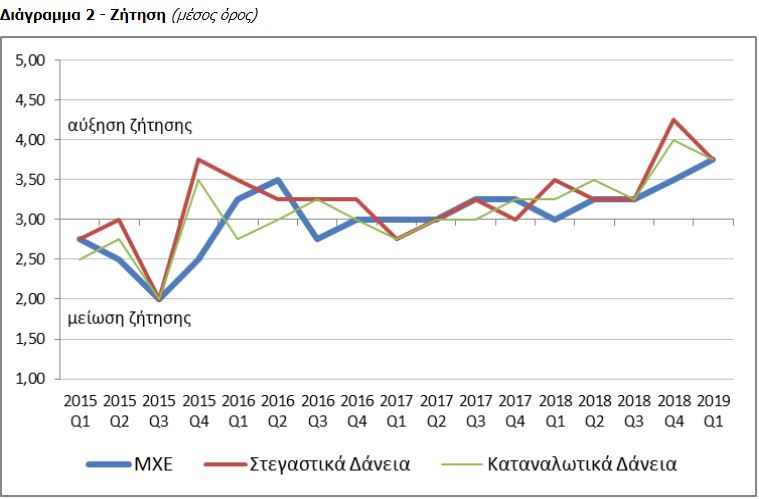 Τα κριτήρια χορήγησης δανείων προς νοικοκυριά αναμένεται να παραμείνουν στα ίδια επίπεδα κατά τη διάρκεια του β΄ τριμήνου του 2019, ενώ η ζήτηση αναμένεται να αυξηθεί ως ένα βαθμό.