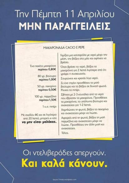 Οι διανομείς σε όλη την Ελλάδα ζητούν μάλιστα τη στήριξη και την κατανόηση όλων καλώντας τους να μην παραγγείλουν στις 11 Απριλίου φαγητό, καφέ κτλ. Εξαιρετικό δε ότι ακόμη και την ημέρα απεργίας φροντίζουν να μην μείνουν νηστικοί οι «πελάτες» τους και τους προτείνουν λύση.
