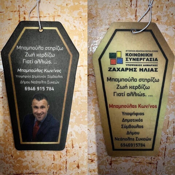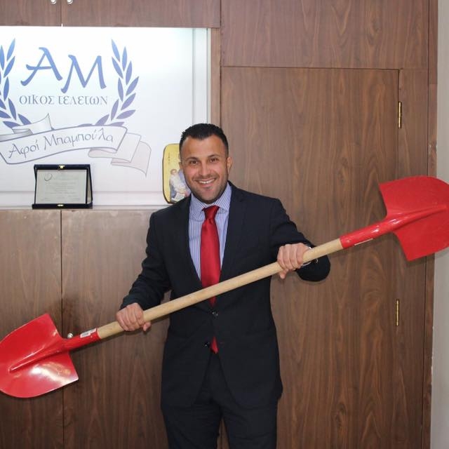 Πρόκειται για ιδιοκτήτη γραφείου τελετών, ο οποίος είναι γνωστός στην τοπική κοινωνία της Θεσσαλονίκης για το χιούμορ του στις διαφημίσεις της επιχείρησής του.