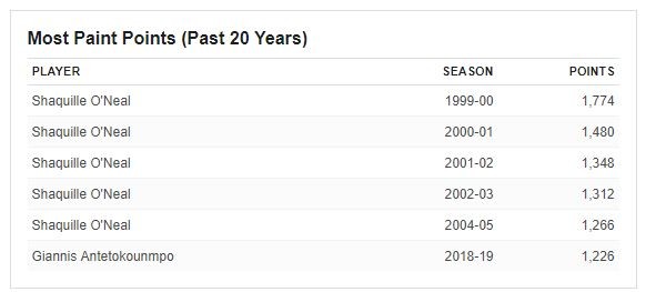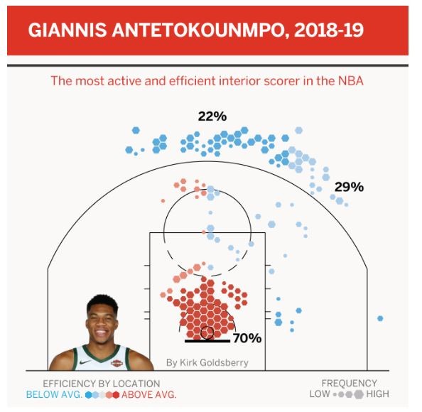 Το κείμενο συγκρίνει τον Γιάννη με άλλους μεγάλους του παρόντος αλλά και του παρελθόντος. Όπως για παράδειγμα τον Σακίλ Ο’ Νίλ, στον τομέα της κυριαρχίας μέσα στη ρακέτα, ειδικότερα όσον αφορά το σκοράρισμα από το «ζωγραφιστό». Ουσιαστικά οι επιδόσεις του σταρ των Μπακς συγκρίνονται μόνο με εκείνες του Σακ για την τελευταία 20ετία.