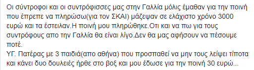 «Οι σύντροφοι και οι συντρόφισσες μας στην Γαλλία μόλις έμαθαν για την ποινή που έπρεπε να πληρώσω(για τον ΣΚΑΙ) μάζεψαν σε ελάχιστο χρόνο 3000 ευρώ και τα έστειλαν. Η ποινή μου πληρώθηκε. Οτι και να πω για τους συντρόφους από την Γαλλία θα είναι λίγο. Δεν θα μας αφήσουν να πέσουμε ποτέ. ΥΓ. Πατέρας με 3 παιδιά (από Αθήνα) που προσπαθεί να μην τους λείψει τίποτα και κάνει δυο δουλειές ήρθε στο βοξ και μου έδωσε για την ποινή 30 ευρώ…», έγραψε το ηγετικό στέλεχος του Ρουβίκωνα στον λογαριασμό του στο Facebook.