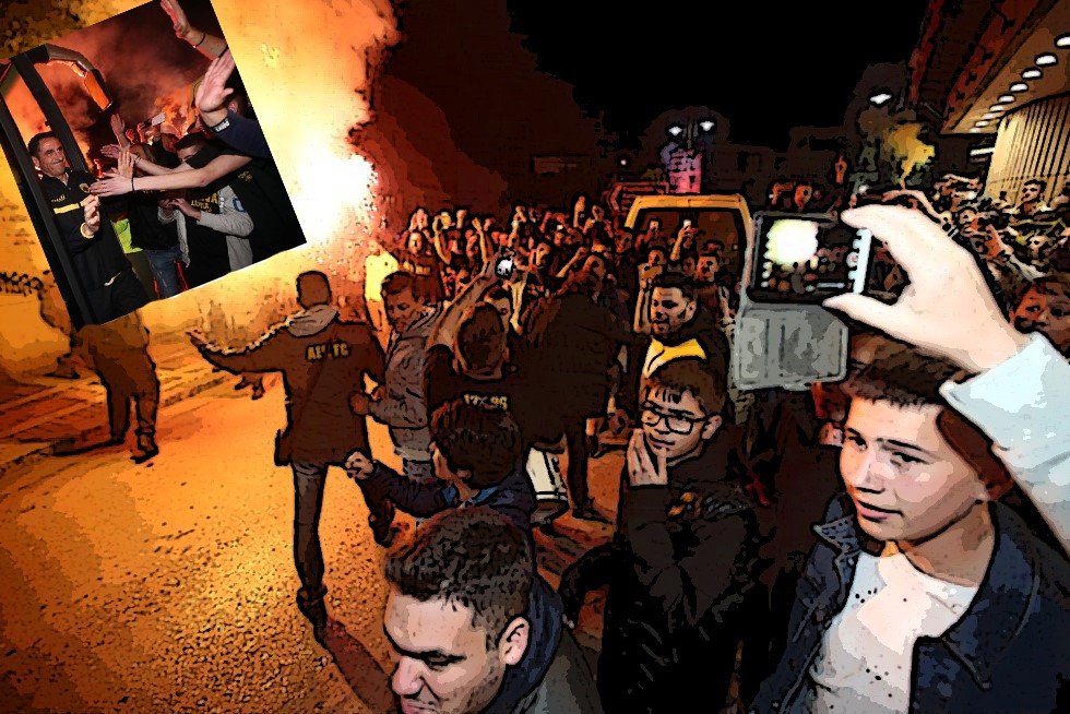 Πολλοί φίλοι της Ένωσης βρέθηκαν έξω από το ξενοδοχείο που έχει καταλύσει η αποστολή του Δικεφάλου, ανάβοντας καπνογόνα, τραγουδώντας συνθήματα και αποθεώνοντας τον Μανόλο Χιμένεθ και τους παίκτες του.
