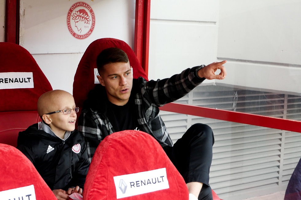 Ο μικρός Βασίλης την Κυριακή (14/04) στο τελευταίο εντός έδρας παιχνίδι της ομάδας του Πειραιά κόντρα στην Ξάνθη, έκατσε στον πάγκο του Ολυμπιακού μαζί με το ίνδαλμα του Λεονάρντο Κούτρη.