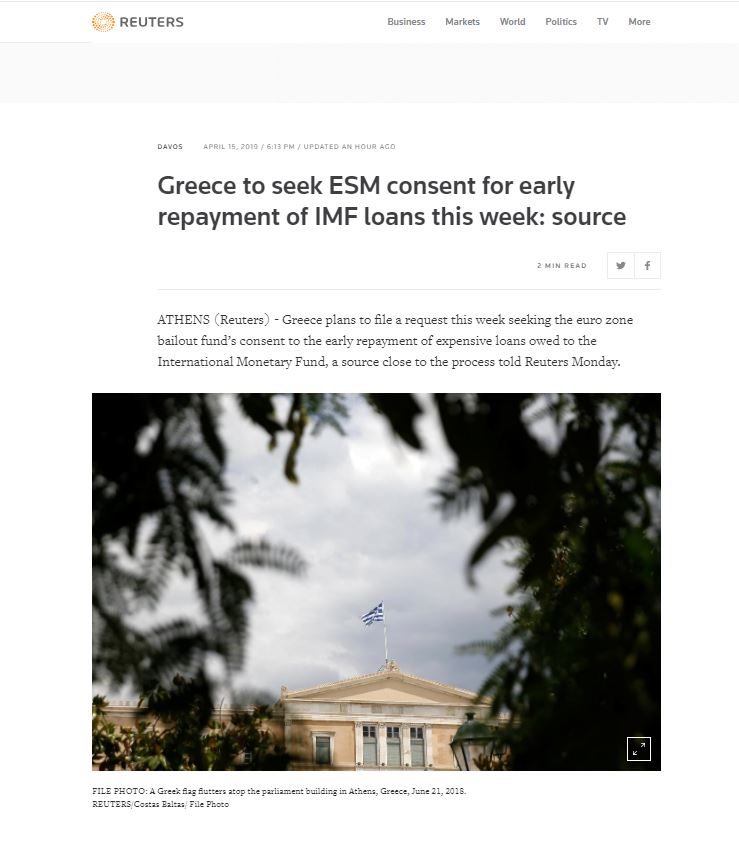 Reuters: Εντός της εβδομάδας το αίτημα στον ESM για αποπληρωμή δανείων του ΔΝΤ