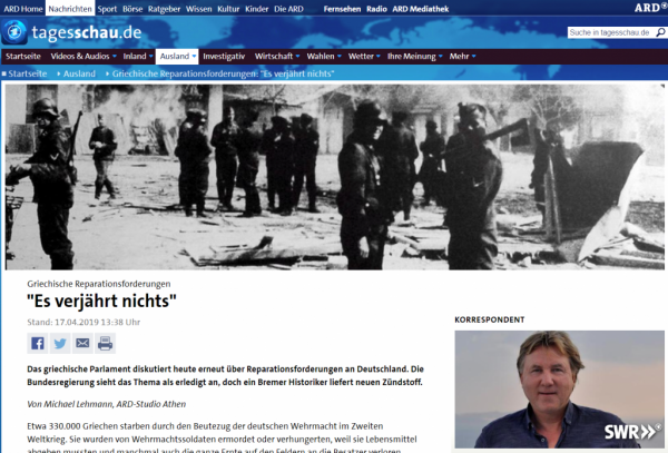 To πρώτο δημόσιο ραδιοτηλεοπτικό δίκτυο της Γερμανίας ARD τιτλοφορεί το άρθρο του «Ελληνικές αξιώσεις αποζημίωσης: Δεν έχει παραγραφεί τίποτα». Στη συνέχεια, υπογραμμίζεται ότι δεν υπάρχει θέμα για τη γερμανική κυβέρνηση και ότι κατά την άποψή της, το κεφάλαιο των αποζημιώσεων έχει κλείσει νομικά.