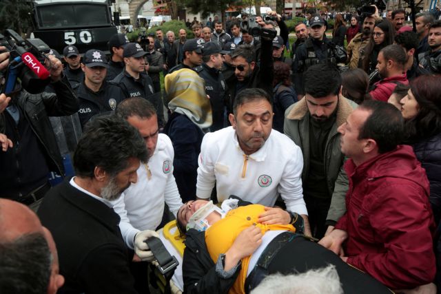 Η βουλευτής του φιλοκουρδικού Κόμματος της Δημοκρατίας των Λαών (HDP), Ρεμζιγιέ Τοσούν τραυματίστηκε σε μια διαδήλωση στο Ντιγιάρμπακιρ, στην νοτιοανατολική Τουρκία, ενάντια στην απόφαση της Ανώτατης Εκλογικής Επιτροπής (YSK) που στερεί τη θητεία από ορισμένους από τους υποψηφίους που κέρδισαν στις δημοτικές εκλογές της 31ης Μαρτίου