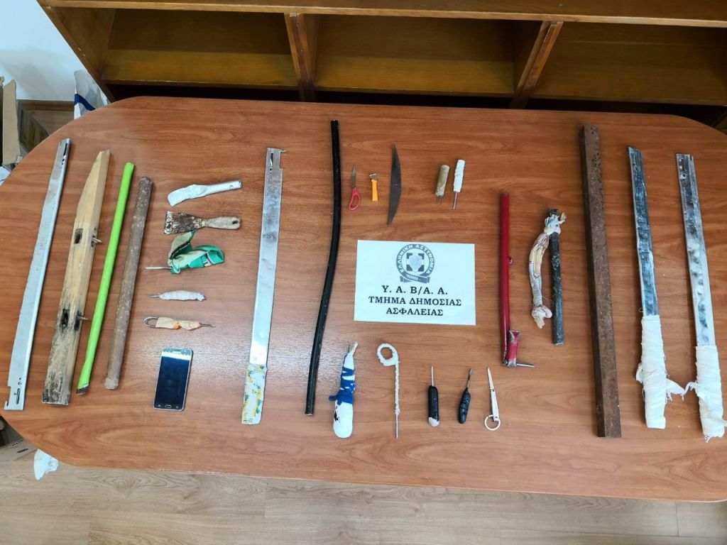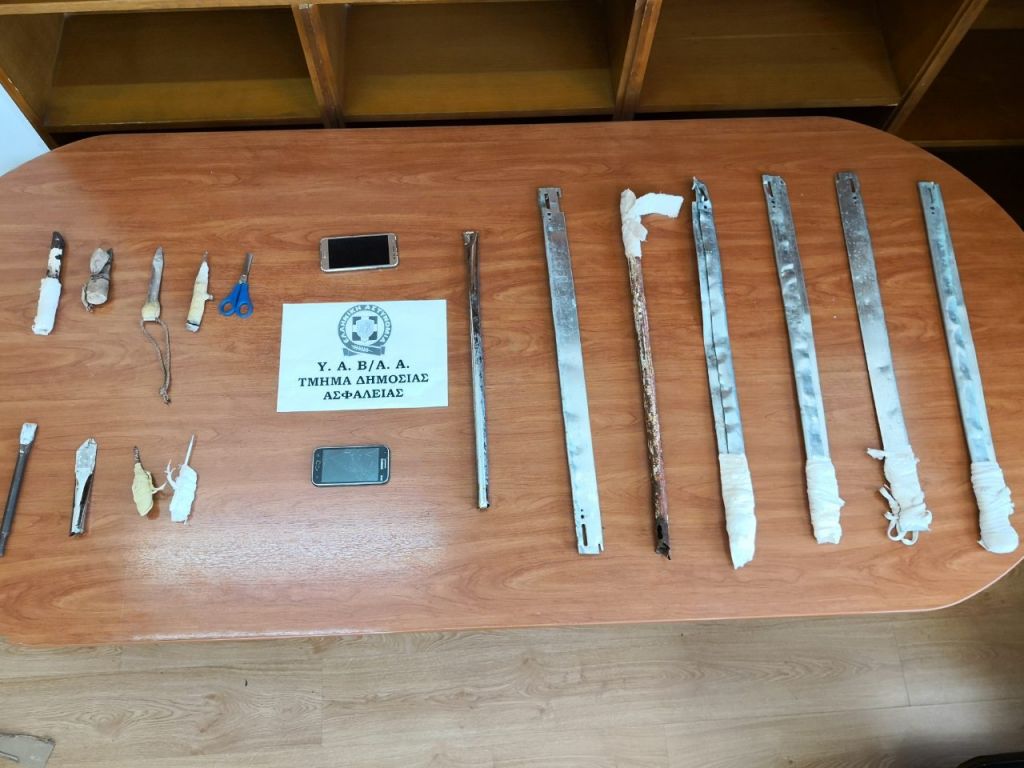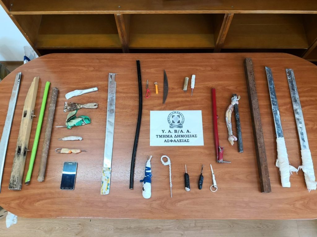 Κατά τη διάρκεια της έρευνας βρέθηκαν και κατασχέθηκαν επιμελώς κρυμμένα σε προσωπικά είδη των κρατουμένων καθώς και σε κοινόχρηστους χώρους των κελιών: (10) λοστοί, (21) αυτοσχέδια μαχαίρια, (6) λάμες, (3) ξύλινα ρόπαλα, (3) κινητά τηλέφωνα, (2) ψαλίδια, καλέμι και μικροποσότητα ναρκωτικής ουσίας.